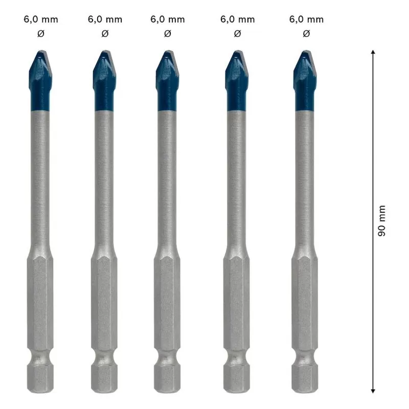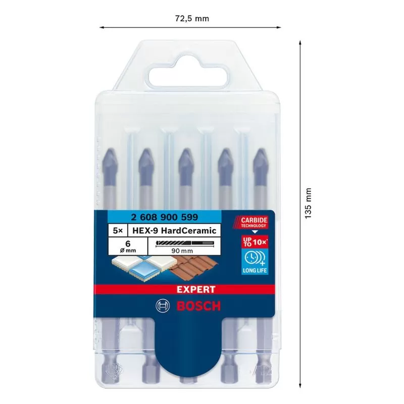 La Broca para porcelanato EXPERT HEX-9 Hard Ceramics de Bosch es la solución para la perforación en porcelanato, vidrios, cerámicas, tejas o piedras naturales. La punta de la Broca tiene tecnología de carburo (Carbide Technology), y el metal duro integrado a la punta proporciona hasta 10 veces más durabilidad comparada con la Broca CYL-9 Ceramic de Bosch. La Broca HEX-9 Hard Ceramics permite perforar en materiales duros sin dañarlos gracias a su punta centralizadora activa, además el diseño de la punta permite generar menos calor y posibilita realizar perforaciones sin humedad. Su afilado preciso garantiza un corte fuerte sin perder la estabilidad. La Broca EXPERT HEX-9 Hard Ceramics es compatible con atornilladores y taladros sin la función de percusión; para medidas superiores a 10mm de diámetro, se recomienda iniciar el agujero con una Broca de 6mm.