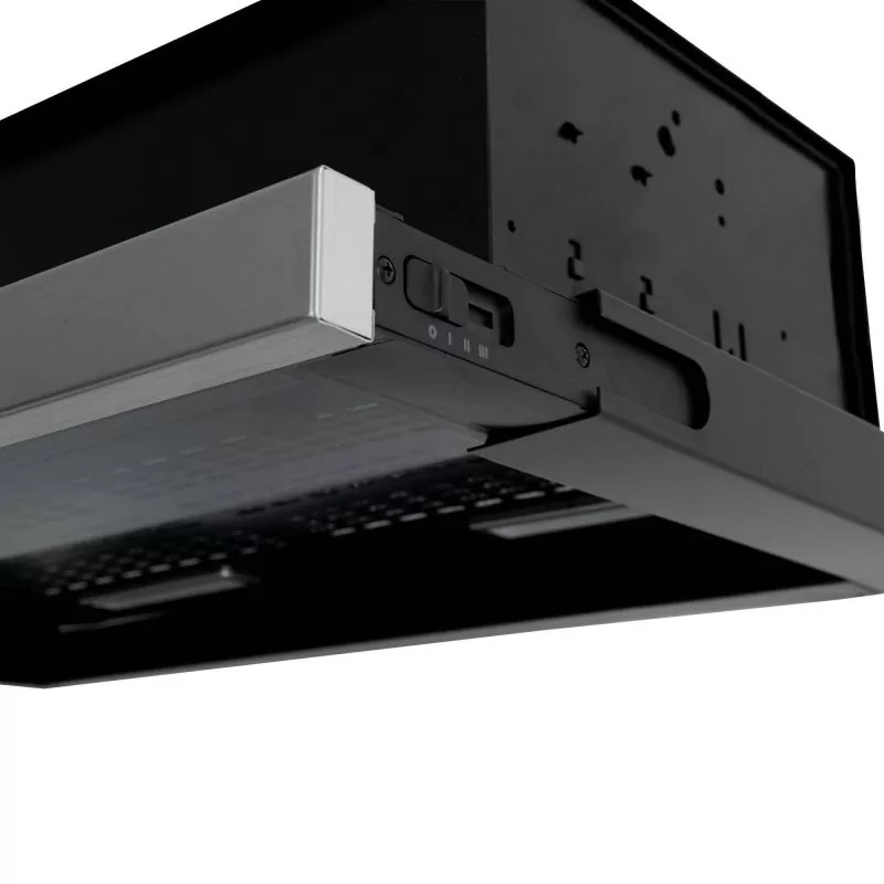 Control manual lateral tipo corredera de 4 posiciones que permite seleccionar las diferentes velocidades con apagado automático del motor al cerrar la visera de la campana.
