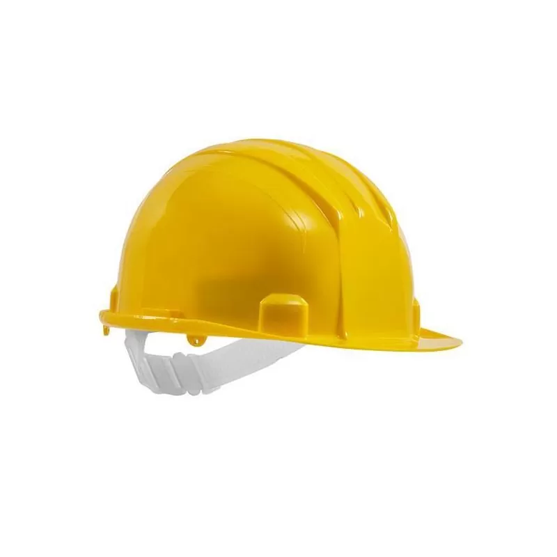Casco Amarillo ECO tipo Capitán, fabricado en HPDE, suspensión en Nylon plástico con graduación vertical, ajuste tipo cremallera y 4 puntos de sujeción.