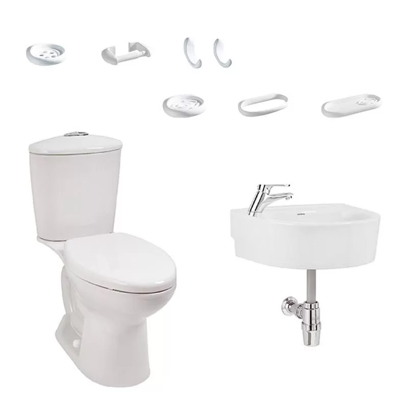 El combo Aquapro AL , le dará a tu baño bienestar y funcionalidad, está compuesto por: -Sanitario Aquapro de dos piezas (tanque y taza), el más ahorrador de agua de Corona con perfil de taza redondo y tecnología EcoFlush, su diseño de taza sin anillo te permitirá un mejor lavado, reduciendo la acumulación de gérmenes y bacterias. -Lavamanos Aquapro de colgar con semipedestal elaborado en porcelana. -Grifería monocontrol Aquapro con chorro de agua espumoso, agradable al tacto y a la vista, con ahorro de agua. -Kit de accesorios Elite cerámicos de 6 piezas (Cepillera, portarollo, 2 perchas, jabonera, toallero y jabonera de ducha).