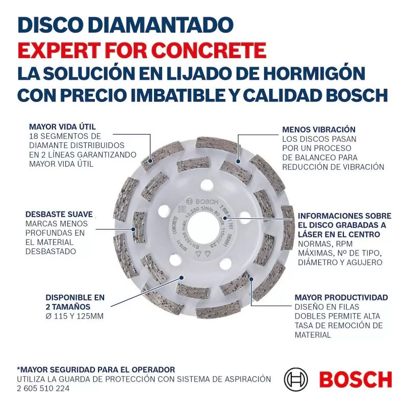 La Copa Diamantada Expert for Concrete tiene un diseño segmentado que proporciona mayor vida útil debido a sus 18 segmentos de diamante distribuidos en 2 líneas, y que también garantizan una mayor productividad, una vez que se reduce la necesidad de intercambio de vasos. El producto se somete por un proceso de balanceo para reducción de la vibración, garantizando la seguridad de usuario.