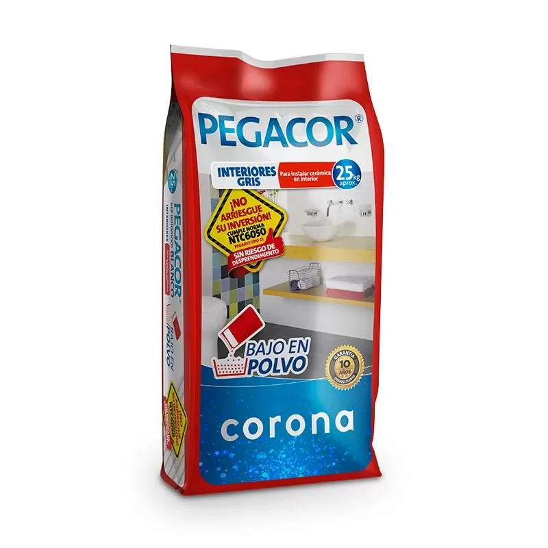 Pegacor para uso interior gris x 25 kilos: Este es un adhesivo bajo en polvo, cementicio (C), de características básicas (1), que cumple la norma NTC 6050, y se clasifica como C1. Adquiere este producto especializado para la instalación de cerámica en interiores.