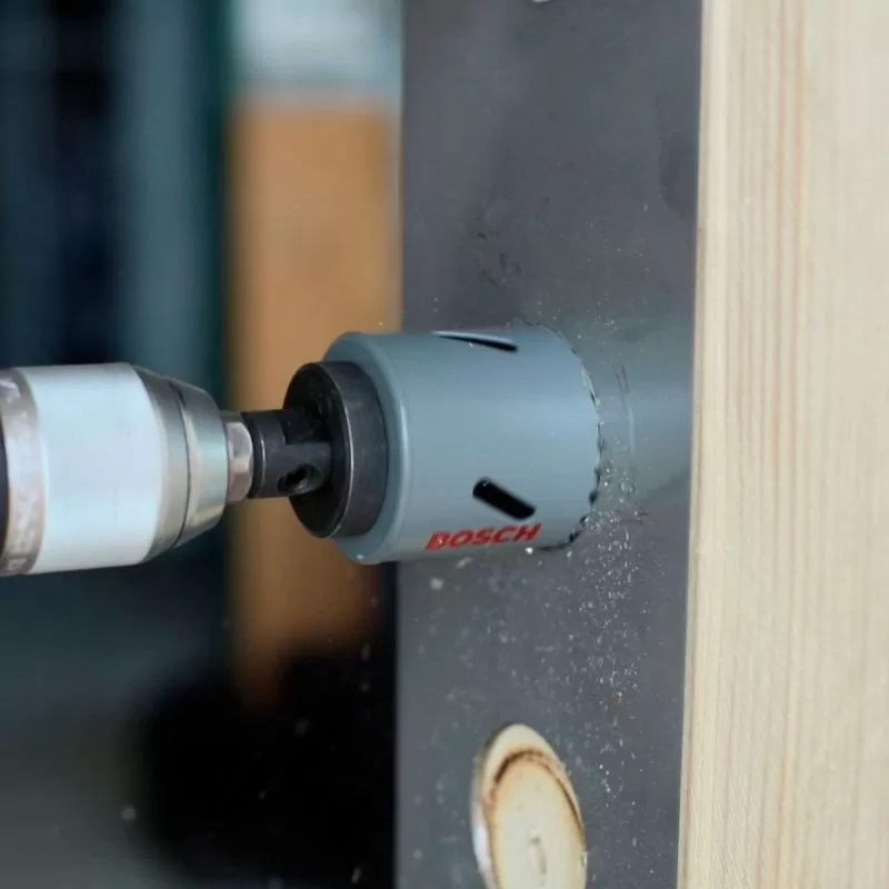 La sierra copa para vasos de madera ya viene con un taladro guía y un accesorio que permite la instalación directa en el mandril compatible y el uso inmediato, hace cortes en materiales blandos como madera, aglomerado de madera, tableros acústicos y yeso, ideales para instalar focos de iluminación. . La configuración de sus dientes está patentada por Bosch y garantiza un corte rápido y eficiente.